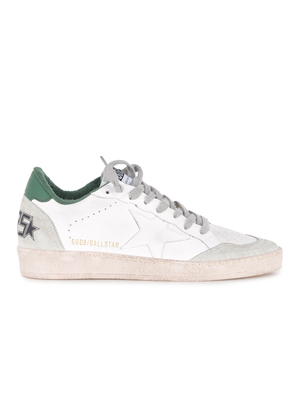 Sneakers Golden Goose " Ball Star" realizzata in pelle di colore Bianco. Punta tonda, traspirante. Patch logo applicato sulla linguetta. Stringata. Lacci a contrasto Grigi. Lettering "GGDB/BALL STAR" di colore Dorato, di lato. Tallone Verde, pelle laminata. Lettering " Sneakers" sul retro. Suola in gomma effetto consumato. Suola 100% Gomma 100% Pelle Made in Italy