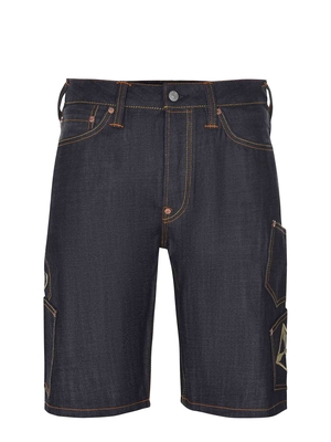 Bermuda Evisu realizzato in denim di colore Blu scuro.Passanti per cintura. Chiusura con bottoni.Cinque tasche.Tasche laterali con patch e stampe ricamate.Logo ricamato sulla tasca posteriore.Toppa in pelle sul retro.100% cotone