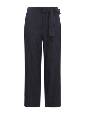 Jeans baggy 'S Max Mara " Bisous" in denim di cotone di colore Blu. Passanti per cintura. Cintura in vita, ricami e pendenti rimovibili all'estremità. Chiusura con gancio e zip. Tasche laterali. Tasche a filo sul retro.100% Cotone Made in Italy