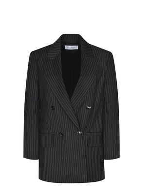 Blazer Max Mara " Mattia" realizzato in lana di colore Blu notte. Gessato. Doppiopetto. Collo rever a lancia. Maniche lunghe e bottoni sui polsi. Chiusura con bottoni. Taschino sul petto e tasche a filetto con patta sul davanti. Spacchi laterali sul retro. Fodera personalizzata Monogram jacquard.100% lana vergine Made in Italy