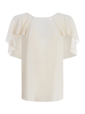 Blousa Pinko " Botanico" in crêpe de Chine di misto seta di colore Avorio. Scollo a barchetta. Maniche corte. Drappeggio effetto mantella. Schiena scoperta. Spalline incrociate. Linea dritta. 70% Acetato, 30% Seta Made in Tunisia