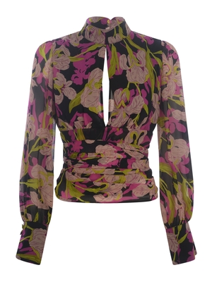 Blousa Pinko " Rivelatore" in leggero georgette di colore Nero. Motivo stampa floreale Iris, multicolor all-over. Colletto alzato, bottoncino sul retro. Maniche lunghe. Polsi con due bottoni. Scollo cut-out, verticale davanti e sul retro. Fusciacca, stesso tessuto da annodare in vita. Chiusura con zip invisibile al centro, sul retro. Foderato. Fodera 100% Poliestere 100% Viscosa Made in Tunisia