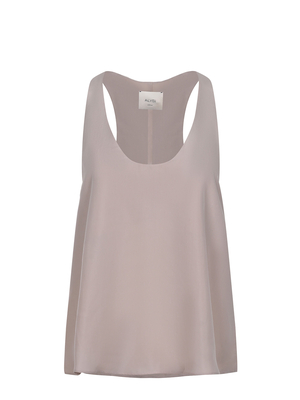 Blusa Alysi realizzata in seta di colore Beige. Modello scivolato. Scollo ampio. Spalline. Spacchi laterali sul fondo.100% seta Made in Italy