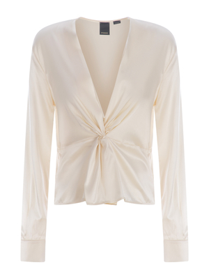 Blousa Pinko "Baradero" in satin di seta stretch di colore Avorio. Scollo a V. Leggermente incrociato. Dettaglio torchon. Maniche lunghe. Polsi con due bottoni. Chiusura con zip di lato. 94% Seta, 6% ElastanMade in Turkey