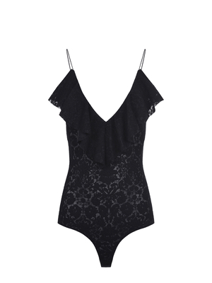 Body Pinko " Black Jak" realizzato in pizzo di colore Nero. Scollo a barca. Maniche lunghe. Effetto patchwork. Micro paillettes ricamate tono su tono.89% nylon 11% elastene ...