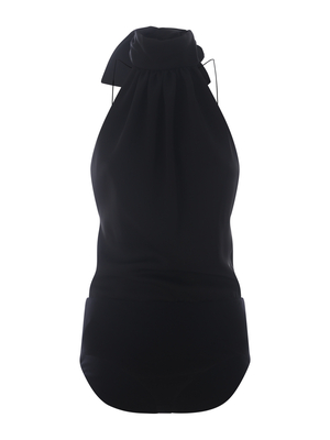 Body Philosophy realizzato in satin di colore Nero. Collo lavallière, allaccia con fiocco sul retro. Spalline elastiche, incrociate sulla schiena, fissate con bottoncini laterali. Fondo a culotte in jersey di cotone, elastico. Chiusura con bottoncini. Foderato. Regular fit. 100% Viscosa Made in Ungheria
