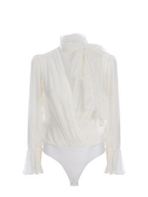Body Pinko "Particella" in leggero chiffon di seta di colore Magenta. Fusciacca da annodare al collo. Scollo a punta, incrocio davanti. Maniche lunghe in trasparenza. Polsi svasati. Fodera in crêpe de Chine. Chiusura con bottoncini. 76% Acetato, 24%SetaMade in Tunisia