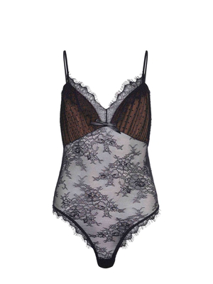 Body Self-Portrait realizzato in misto poliestere di colore Nero. Spalline sottili regolabili. Scollo a V con dettagli in pizzo e pois sul busto. Foderato sul busto. Fiocco in pelle sul davanti. Trasparente in pizzo sul davanti e sul retro. Chiusura con bottoni automatici.82% poliestere 18% elastene