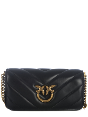 Borsa baguette Pinko " Love Baguette Click" in nappa trapuntata di colore Nero. Motivo chevron. Logo " Love Birds Diamond Cut" in metallo Antique Gold davanti. Effetto cut-out. Interno foderato, in microfibra scamosciata. Tasca interna con zip. Manico in pelle rimovibile con moschettoni. Tracolla combina catena in metallo, spallaccio in pelle regolabile. Logo " Love Birds" ricamato tono su tono sul retro. Misure Altezza 12cm, Larghezza 6cm, Lunghezza 25cm Fodera 50% Poliammide, 50% Poliuteranica Tessuto 100% Pelle Made in China