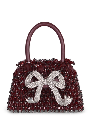 Borsa self-Portrait realizzata in pelle di colore Borgogna. Manico rigido sulla parte superiore. Tracolla in pelle removibile. Chiusura con bottone automatico. Interamente rivestita da strass e goccie in acrilico. Maxi fiocco sul davanti rivestito da strass e perline. Foderata.100% pelle