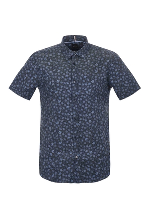 Camicia Boss in misto lino Blu fantasia floreale. Colletto classico. Manica corta. Chiusura con bottoni. Misura in foto M85% lino, 15% elastene