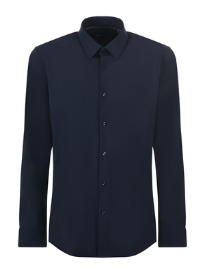 Camicia Boss in jersey Blu scuro. Collo classico. Chiusura con bottoni. Manica lunga. Polsino regolabile con bottoni. Slim fit. Misura in foto 3976% poliammide, 24% elastene