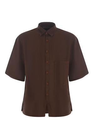 Camicia Costumein "Stefano" realizzata in lino di colore Marrone. Colletto classico a punta. Maniche corte. Tasca applicata sul petto. Chiusura con bottoni, davanti. 100% LinoMade in Italy