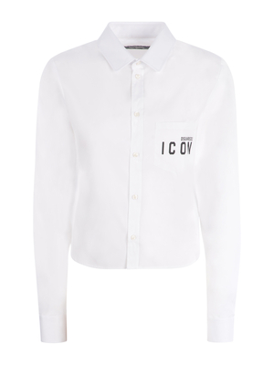 Camicia crop Dsquard 2 " Icon" in cotone di colore Bianco. Colletto. Maniche lunghe. Polsi con bottone. Tasca applicata sul petto. Lettering logo " Dsquared 2 Icon" a contrasto Nero. Chiusura con bottoni. 100% Cotone Made in Italy