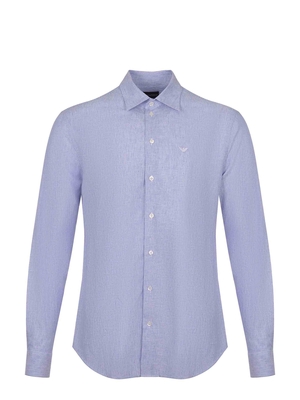 Camicia Emporio Armani realizzata in misto lino di colore blu. Micro righe blu e bianche. Maniche lunghe. Polsini con bottoni. Colletto classico. Logo ricamato sul petto a contrasto.55% lino 45% cotone