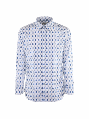 Camicia Etro in popeline stretch Bianco/ Azzurro fantasia loghi e micro paisley. Colletto all'italiana. Manica lunga. Polsi con bottoni. Chiusura con bottoni. Regular fit. Misura in foto 4097% cotone, 3% elastene