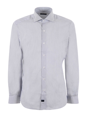 Camicia Fay in popeline stretch fantasia micro righe Bianco/ Blu. Collo francese. Chiusura con bottoni. Manica lunga. Polso con bottone. Misura in foto 4075% cotone, 22% poliammide, 3% elastene
