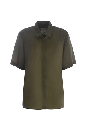 Camicia Max Mara " Accanto 1234" realizzata in organza di pura seta di colore Verde Oliva. Colletto a punta. Maniche corte. Chiusura con bottoni nascosti. Silhouette dritta. Spacchetti laterali. Contropiega al centro sul retro. 100% Seta Made in Italy