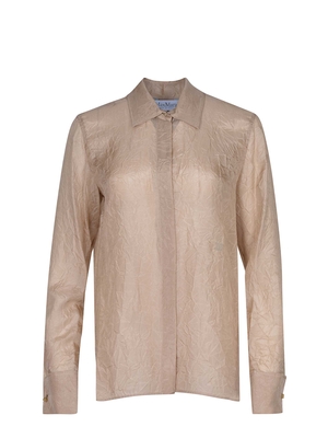 Camicia Max Mara " Eloisa" realizzata in seta di colore Cammello. Classico colletto a punta. Maniche lunghe con polsino alto a gemello. Chiusura frontale con bottoni nascosti. Piccolo ricamo M Monogram sul davanti. Taglio sprone con piega sul retro. Spacchi laterali.100% seta Made in Italy