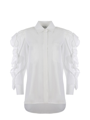 Camicia Max Mara " Pleiadi" realizzata in popeline di cotone di colore Bianco. Colletto classico. Maniche lunghe, sbuffo. Rouches applicate su tutta la lunghezza delle maniche. Polsi a gemello. Tasca applicata sul petto. Chiusura con bottoni nascosti, davanti. Spacchetti laterali. Due pieghe sul retro. Fondo asimmetrico. 97% Cotone, 3% Elastan. Made in Italy
