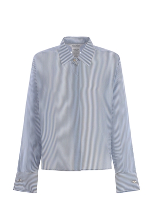 Camicia Max Mara " Vertigo" realizzata in tela di cotone e seta di colore Bianco. Motivo a righe a contrasto Azzurro. Colletto. Maniche lunghe. Polsi alti a gemello. Chiusura frontale, bottoni nascosti. Asimmetrica al fondo, leggermente più lungo sul retro. Spacchetti laterali. Fit fluido. 72% Cotone, 28% Seta Made in Italy