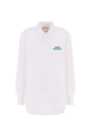 Camicia over MC2 Saint Barth in cotone seersucker Bianco a righe verticali. Colletto classico. Ricamo " Forde dei Marmi" frontale e sul retro. Abbottonatura frontale. Manica lunga. Cannoncino sul retro. Misura in foto S100% cotone