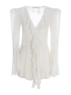 Camicia Philosophy realizzata in georgette di colore Bianco. Scollo a v con rouches. Maniche lunghe, rouches. Taglio in vita. Chiusura con bottoncini nascosti. Fondo svasato. Silhouette fluida. 100% Viscosa