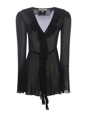 Camicia Philosophy realizzata in georgette di colore Nero. Scollo a v con rouches. Maniche lunghe, rouches. Taglio in vita. Chiusura con bottoncini nascosti. Fondo svasato. Silhouette fluida. 100% Viscosa
