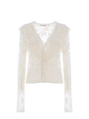 Camicia Philosophy realizzata in tessuto di colore Bianco. Effetto devorè motivo "Fiori" di colore Bianco. Semi-trasparente. Scollo a punta. Rouche al collo. Maniche lunghe. Orlo dritto. 86% Viscosa, 14%Poliammide
