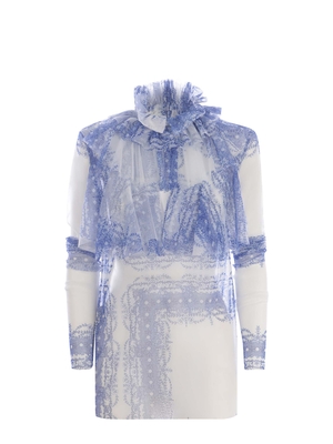 Camicia Philosophy realizzata in tulle effetto pizzo di colore Bianco. Fantasia a contrasto Blu effetto acquerello degradé all-over. Collo con rouches. Maniche lunghe. Maniche extra-long. Regular fit. 100% Poliestere
