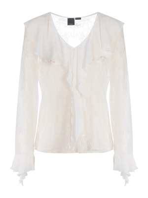 Camicia Pinko " Bahia" in pizzo di colore Bianco. Maniche lunghe. Polsi con bottone. Scollo a punta. Dettaglio rouche al collo, maniche. Top tono su tono. Top 100% Poliestere 100% Poliammide Made in Tunisia