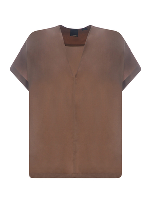 Camicia Pinko " Breve" in misto seta di colore Bronzo. Scollo a V. Maniche corte. Non ha chiusure. Regular fit. 94% Seta, 6% Elastan Made in Turchia