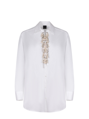 Camicia Pinko " Capirai" realizzata in cotone di colore Bianco. Scollo a V. Ricamo fatto a mano con applicazioni in vetro e catenelle metalliche con strass. Maniche lunghe. Polsini con bottoni. Chiusura sul davanti con bottoni.100% cotone Made in Italy