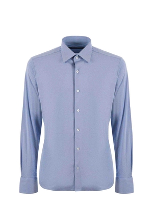 Camicia RRD in jersey elasticizzato Bianco/ Blu con motivo oxford jacquard. Fantasia "punto a spillo". Collo classico. Manica lunga. Polsi con bottoni. Chiusura con bottoni. Slim fit. Misura in foto 4886% poliammide, 14% elastane