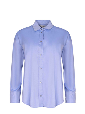 Camicia S' Max Mara " Ateneo" realizzata in cotone di colore Celeste. Colletto a punta. Maniche lunghe con spalla scesa. Polsino con bottone. Chiusura frontale con bottoni in madreperla. Taglio sprone sul retro e piega centrale sulla schiena.100% cotone Made in Italy