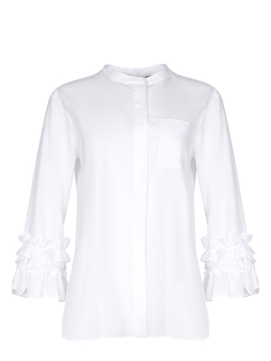 Camicia 'S Max Mara " Favola" realizzata in cotone di colore Bianco. Colletto alla coreana. Maniche lunghe a giro con rouches. Chiusura frontale con bottoni nascosti. Taschino applicato sul petto. Taglio sprone e profondo contropiego sul retro. Fondo più lungo sul retro con spacchi laterali.100% cotone Made in Italy