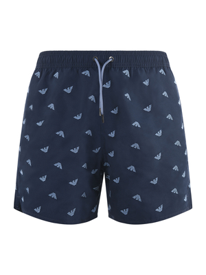 Costume Emporio Armani in tessuto tecnico Blu scuro con loghi "eagle ricamati su tutta la superficie. Elastico in vita con coulisse. Tasche a filo. Slip a rete inserito. Tasca sul retro. Misura in foto 48100% poliestere