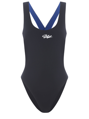 Costume intero OFF-White jersey tecnico Nero. Stampa logo a contrasto Bianco sul davanti. Scollo tondo. Spalline multicolore incrociate con motivo logo sul retro.72% Poliammide, 28% Elastan