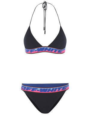 Costume OFF-White in tessuto tecnico Nero. Top bikini elasticizzato Nero con orlo elasticizzato logato multicolor. Allacciatura regolabile con stringhe sottili. Slip bikini elasticizzato nero con fondo elasticizzato logo Off-White multicolor.72% Poliammide, 28% Elastan