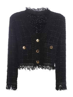 Giacca corta Pinko " Babbuino" in misto lana di colore Nero. Fantasia check lurex all-over. Scollo a punta. Maniche lunghe. Patte effetto taschini di lato. Chiusura con bottoni in metallo Dorato. Capo, polis e fondo capo effetto sfrangiato. Linea aderente.80% Poliestere, 8% Acrilica, 4% Fibra Metallica, 4% Poliammide, 2% Lana, 1% Alpaca Made in China