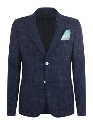 Giacca Daniele Alessandrini in tessuto tecnico Blu scuro fantasia quadri. Revers a lancia. Maniche lunghe. Polsi senza bottoni. Monopetto. Taschino sul petto con fazzoletto fantasia. Chiusura con due bottoni bianchi. Tasche a filo. Sfoderata. Decostruita. 60% poliammide, 40% poliestere Made in Italy