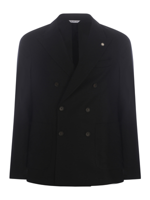 Giacca doppiopetto Manuel Ritz in lana di colore Nero. Rever a lancia. Spilla iconica del brand applicata sul rever. Maniche lunghe. Maniche foderate. Polsi con quattro bottoni. Tasca a filo sul petto. Chiusura doppiopetto con sei bottoni. Tasche laterali. Fodera 100% Viscosa 98% Lana, 2% Elastan Made in Bulgaria