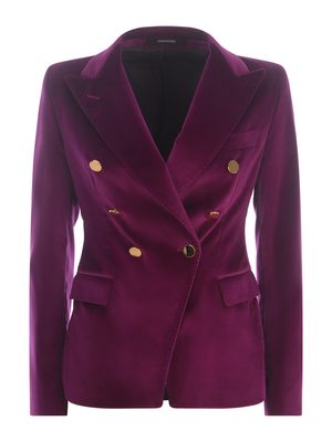 Giacca doppiopetto Tagliatore "J-Alicya" in velluto di colore Fucsia. Rever a lancia. Tasca a filo sul petto. Maniche lunghe. Polsi con quattro bottoni, non apribili. Doppiopetto. Chiusura con due bottoni, in metallo Dorato. Tasche con patta di lato. Spacco centrale, sul retro. Foderata. Fodera 100% Cupro 98% Cotone, 2% Elastan Made in Italy