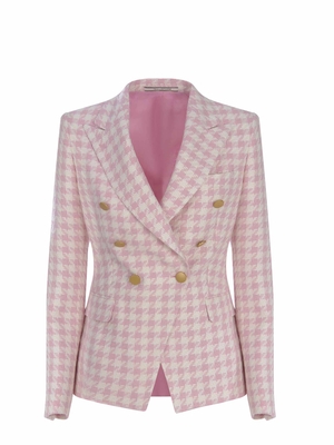 Giacca doppiopetto Tagliatore "J-Alycia" realizzata in viscosa di colore Bianco. Motivo pied de poul di colore Rosa. Collo con rever a punta. Maniche lunghe. Polsi con bottoni in metallo Dorato. Tasche a filo sul petto. Doppiopetto. Chiusura con bottoni in metallo Dorato. Tasche laterali con patta. Spacchetto sul retro. Slim fit.41% Viscosa, 33% Poliestere, 26% Lino Made in Italy