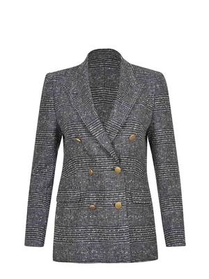 Giacca doppiopetto Tagliatore "J-Parigi" in misto lana di colore Nero. Motivo a quadri con micro dettagli di colore Dorato. Rever a lancia. Tasca a filo sul petto. Maniche lunghe. Polsi con quattro bottoni, non apribili. Doppiopetto. Chiusura con due bottoni Dorati. Tasche con patta di lato. Spacco centrale, sul retro. Foderata. Fodera 100% Cupro 26% poliammide 25% lana vergine 25% acrilica 23% viscosa 1% elastene Made in Italy