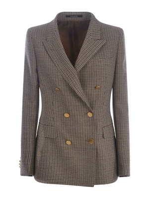 Giacca doppiopetto Tagliatore "J-Parigi" in lana vergine di colore Marrone. Motivo pied de poule. Rever a lancia. Tasca a filo sul petto. Maniche lunghe. Polsi con quattro bottoni, non apribili. Doppiopetto. Chiusura con due bottoni, in metallo Dorato. Tasche con patta di lato. Spacco centrale, sul retro. Foderata. Fodera 100% Cupro 100% Lana Vergine Made in Italy