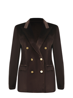 Giacca doppiopetto Tagliatore "J-Parigi" in misto cotone di colore Marrone Effetto velluto. Rever a lancia. Tasca a filo sul petto. Maniche lunghe. Polsi con quattro bottoni, non apribili. Doppiopetto. Chiusura con due bottoni Dorati. Tasche con patta di lato. Spacco centrale, sul retro. Foderata. Fodera 100% Cupro 98% cotone 2% elastene Made in Italy