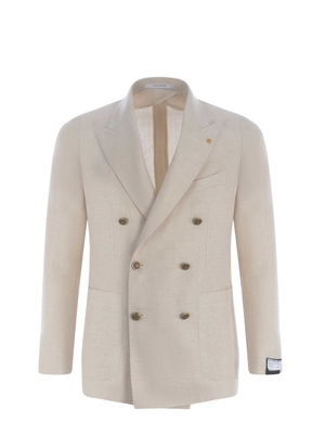 Giacca Tagliatore realizzata in misto lana vergine e lino di colore Crema. Collo con rever classico. Spilla iconica del brand applicata sul rever. Maniche lunghe. Polsi con quattro bottoni. Tasca a filo sul petto. Doppiopetto. Chiusura con bottoni. Tasche applicate ai lati. Doppio spacco sul retro. Orlo dritto. Semi-fodata. 100% Cupro 58% Lana Vergine, 42% Lino Made in Italy