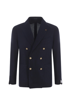 Giacca Tagliatore realizzata in misto lana vergine e lino di colore Blu. Collo con rever classico. Spilla iconica del brand applicata sul rever. Maniche lunghe. Polsi con quattro bottoni. Tasca a filo sul petto. Doppiopetto. Chiusura con bottoni. Tasche applicate ai lati. Doppio spacco sul retro. Orlo dritto. Semi-fodata. 100% Cupro 58% Lana Vergine, 42% Lino Made in Italy