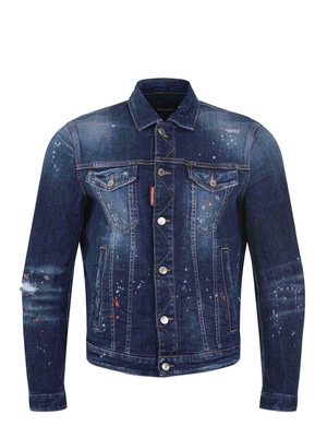 Giacca Dsquared 2 in denim di cotone Blu scuro. Maniche lunghe. Polsi con bottone. Colletto a camicia. Chiusura con bottoni sul davanti. Tasche finte sul petto con patta e bottoni. Tasche a filo laterali. Dettagli schizzi di colore sul davanti e sul retro a contrasto. Etichetta rossa Dsquared 2 che decora la chiusura.99% cotone 1%elastene Made in italy